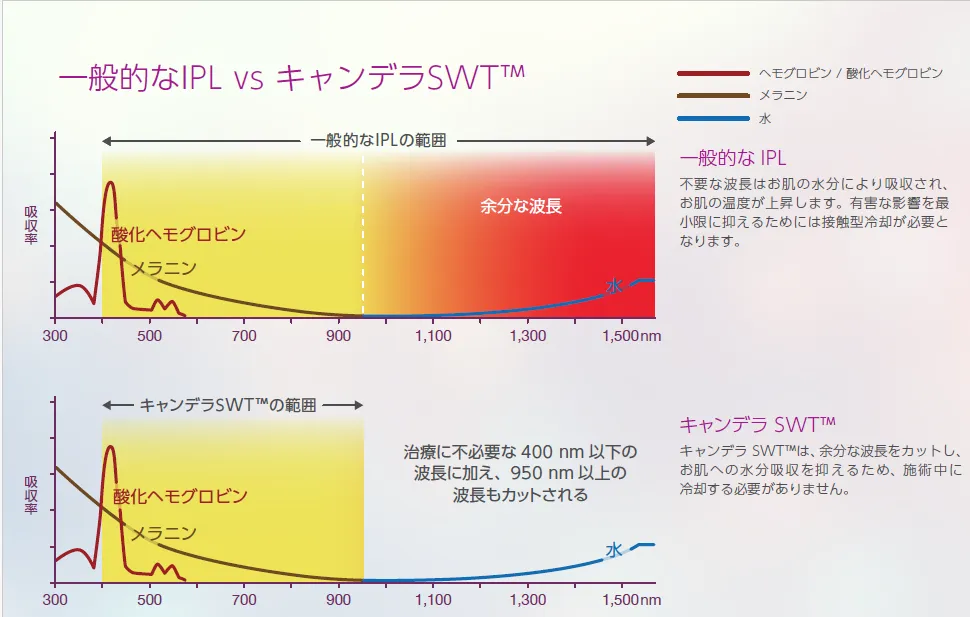 従来のIPL治療では、治療に不要な波長が含まれるため、肌の温度が上がりすぎないよう冷却が必要でした 。 ノーリスが採用している特許技術「SWT™(セレクティブ・ウェーブバンド・テクノロジー)」は、治療に不要な400nm以下の波長と、水に反応して熱を発生させる950nm以上の波長をピンポイントでカットします 。